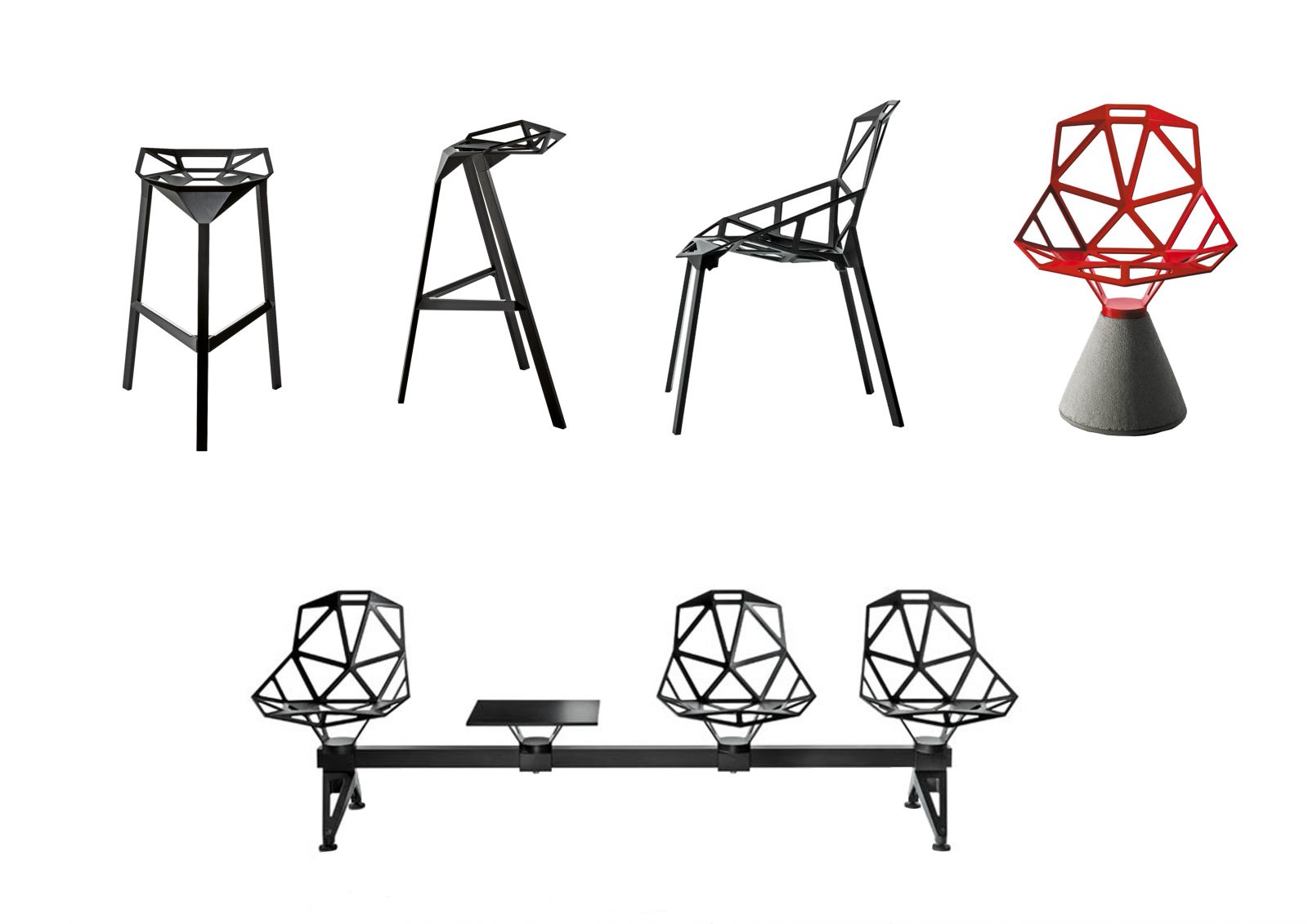 Chair One (keturių kojų kėdė) buvo pirmoji, garsiosios dizainerio Konstantin Grcic kolekcijos kėdė, sukurta 2003 m. Šioje išskirtinėje, industrinio dizaino kėdėje, buvo puikiai sujungta įdomi forma kartu su komfortu: struktūra susideda iš plokščių geometrinių formų, kurios tarpusavyje sujungtos kraštuose formuoja stiprų vizualą kėdės pavidale. Mėgstantiems minkštesnį sėdėjimą yra siūloma paminkštinanti pagalvėlė, kuri gali būti apvilkta audiniu arba oda. Taip pat, ši kėdė yra atspari ugniai ir dažyta jos versija gali būti naudojama ne tik interjere, bet ir eksterjere.