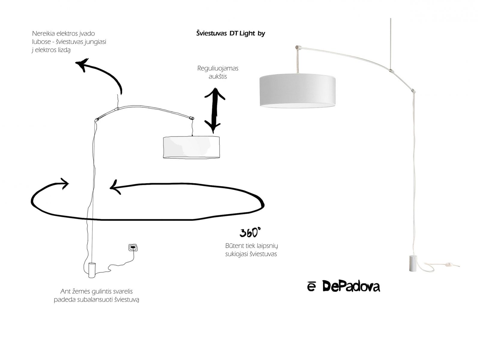 Šviestuvas, kuris gyvena kartu su jumis! Ten kur judi tu - kartu su tavimi ir šviestuvas LT Light. Alkūnė tvirtinama prie lubų, o jos ilginis sukasi aplink savo ašį 360 laipsnių kampu. Balansui užtikrinti naudojamas svarelis, kuris visad dedamas ant grindų. Neturite elektros įvado lubose? Jo ir nereikia, mat šviestuvas jungiasi į elektros lizdą.