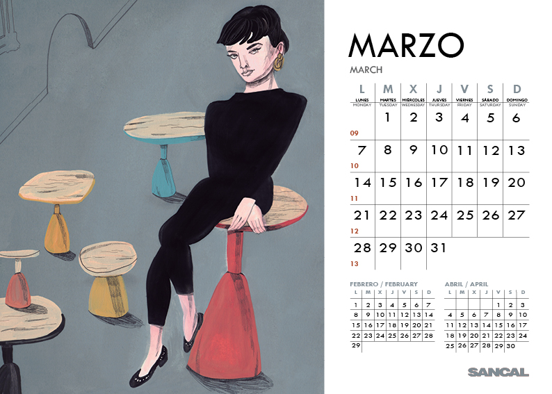 Bendras SANCAL gamintojo ir menininkės Maria Herreros darbas : KOVO mėnesio iliustracija su PION staliukai.