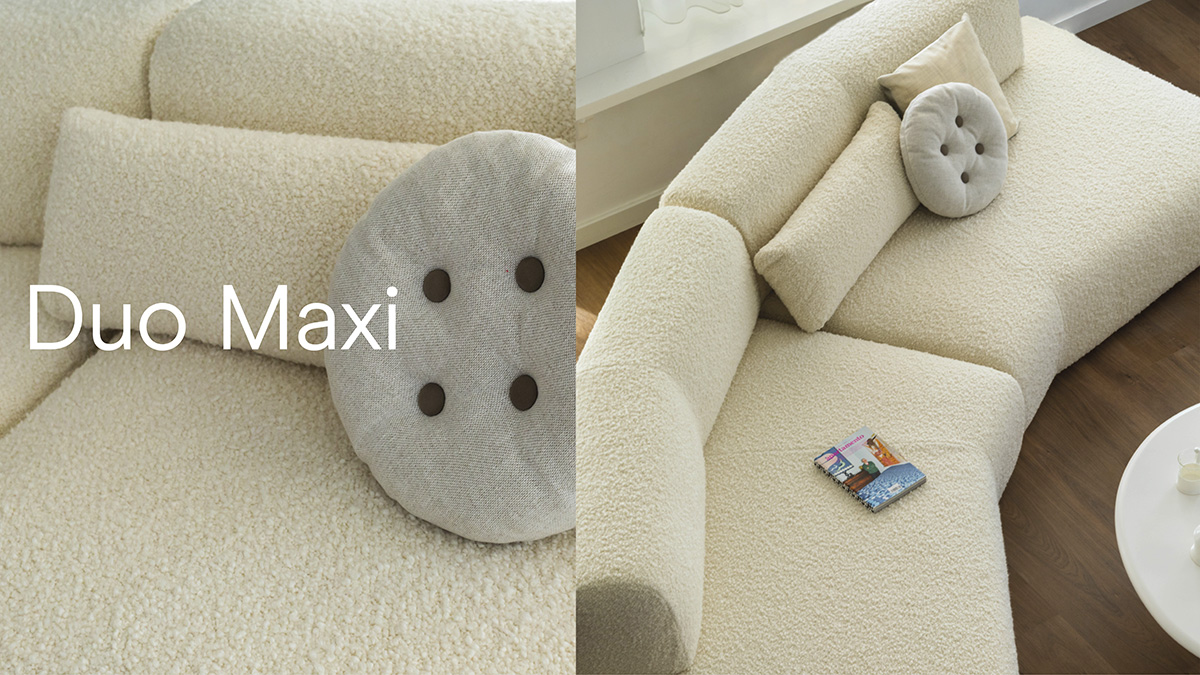 Sėdimosios dalies gylis ir modulių pasirinkimas yra pagrindiniai „Duo Mini“ ir „Duo Maxi“ skirtumai. Dabar kiekvieną modulį galima naudoti atskirai kaip išbaigtą detalę, o gili sėdimoji erdvė suteikia galimybę žaismingai užpildyti sofą papildomomis atraminėmis ar dekoratyvinėmis pagalvėmis.