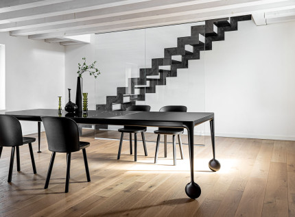 Pagrindinis transformuojamo stalo akcentas – ratukai, kurie leidžia lengvu judesiu , be vargo išilginti stalą, o estetiniu požiūriu suteikia BIG WILL dizainui netikėtumo ir intrigos detalę. Genialiai pašėlusio prancūzų dizainerio Philippe Starck pasirinktos netradicinės šaltosios medžiagos, plienas bei stiklas, pakylėja stalo estetiką į kitą dimensiją: suteikia jam charakteringą išskirtinumą, neginčijamą stotą bei pramoninio stilliaus šaunumą. Norintiems šiltesnio efekto - juodai dažyta stalo konstrukcija ir amerikietiško riešuto stalviršis.