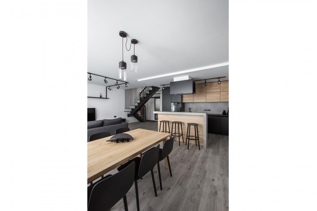 Juodai balta, pilka, truputis medienos skleidžiamo jaukumo ir šilumos, minimaliai daiktų ir dekoro - tokios pagrindinės šio interjero savybės. Siekta maksimaliai efektyviai išnaudoti turimą plotą, racionaliai suskirstyti funkcines zonas ir vizualiai išplėsti erdves.